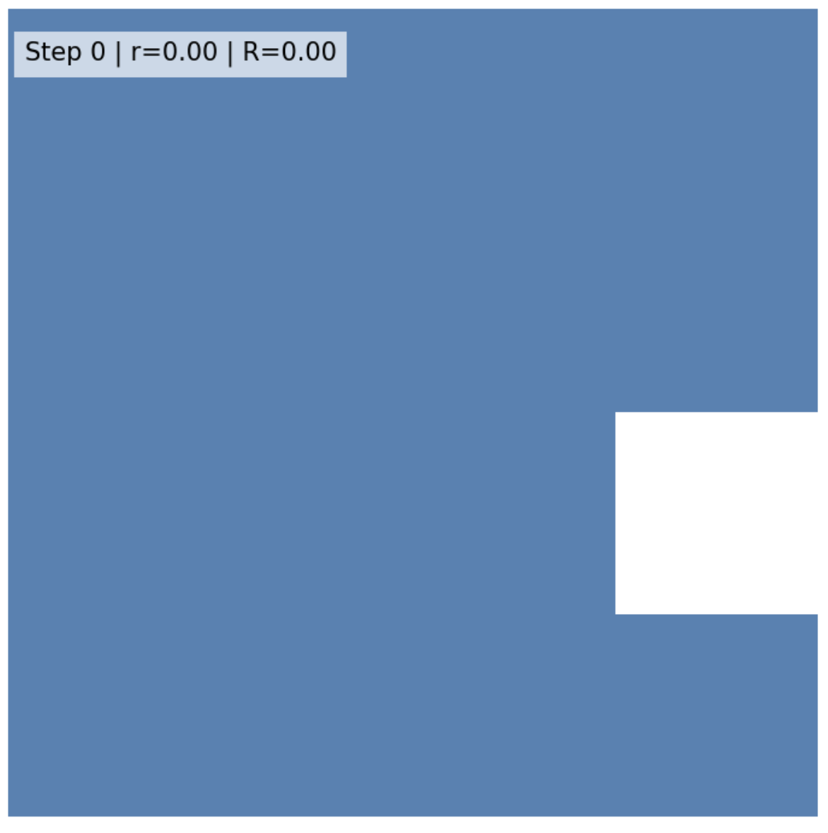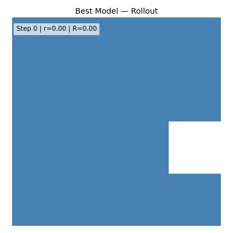 success_rateandavg_steps(higher is better here due to monotonic, no‑rollback dynamics); optional final PNG/GIF render of the best policy rollout. - Model selection: we keep the best checkpoint rather than the last one (selected by maximizing evaluation metrics — primarily