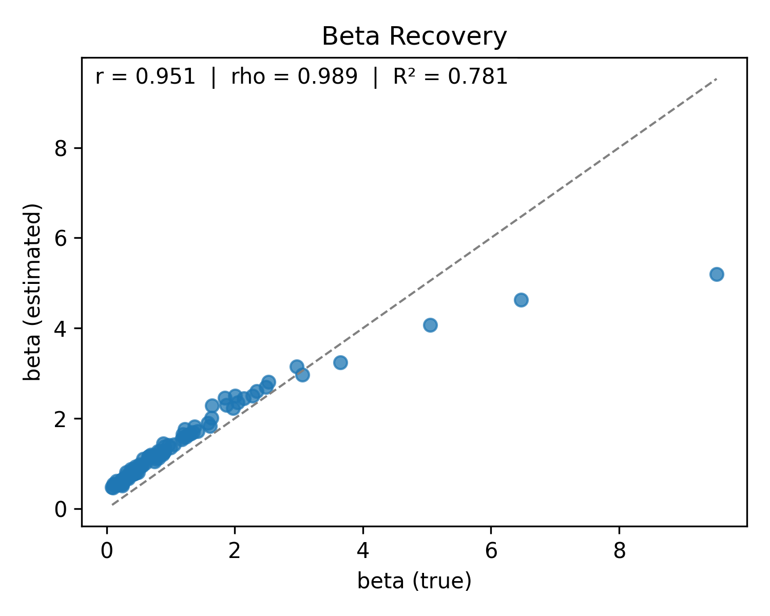 We estimate participant ability (inverse temperature) and compare it with ground truth. Summary metrics for the scatter plot: